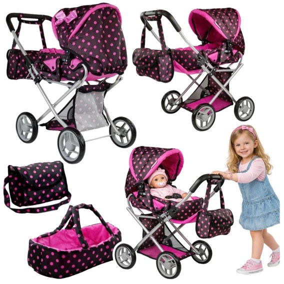 Wózek ma stonowane kolor, co nie rozprasza dziecka. Materiał wózka ma kolor czarny w różowe groszki. Po boku daszku znajduje piękna różowa kokardka. Wózek ma dużo więcej zalet. Lalkę nie tylko można przewozić na leżąco, ale gondola ma także możliwość złożenia na spacerówkę, aby lalka nie wypadła, zamontowane są dodatkowo szare pasy. Daszek również ma możliwość złożenia. Potrzebne akcesoria dla lalki można schować do dołączonej torby. Dodatkowo w zestawie jest nosidełko, a na dole wózka znajduje się koszyczek na najpotrzebniejsze rzeczy.