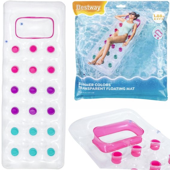 Rewelacyjny dmuchany materac do pływania Bestway świetnie sprawdzi się podczas leniuchowania w wodzie. Bajecznie kolorowy materac z przeźroczystym okienkiem zapewni czystą przyjemność podczas odpoczynku. Prezentowany produkt w letnich, świeżych kolorach bardzo efektownie będzie reprezentował się na każdej plaży.