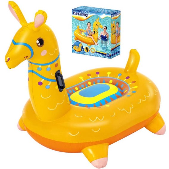 Bestway® Llama Kiddie to idealna propozycja od firmy Bestway dla wszystkich dzieci. Sprawdzi się podczas nie jednej zabawy w przydomowym basenie jak również podczas wakacyjnego wyjazdu. Ponton wykonany został z wytrzymałego materiału PVC odpornego na uszkodzenia i działanie promieni słonecznych jak również wyposażony w dwa solidne uchwyty ułatwiające dzieciom trzymanie się podczas zabawy w wodzie. Ponton w wyjątkowym i oryginalnym kształcie lamy na pewno przyciągnie uwagę wszystkich dzieci oraz wczasowiczów świetnie sprawdzi się podczas wypoczynku nad morzem, jeziorem, czy basenem. Imprezowa grafika, kolor i cztery mini nóżki nadają mu autentyczny wygląd. Po prostu nadmuchaj lamę i jesteś gotowy na idealny dzień w wodzie.
