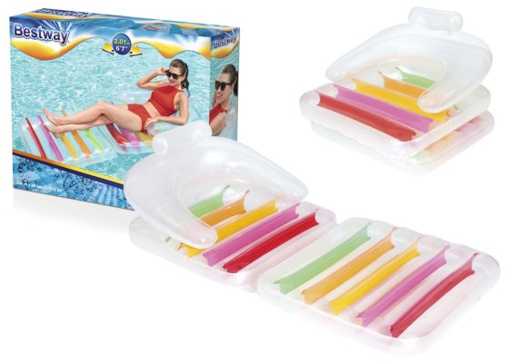 Bardzo wygodny i praktyczny materac przyda się wszystkim miłośnikom zarówno wody jak i spędzania czasu na plaży. Materac może służyć zarówno jako klasyczny materac do pływania, opalania jak i fotel do siedzenia . Dodatkowym atutem, który zapewni Ci wygodę i relaks są podłokietniki i dmuchane oparcie. Klasyczne białe elementy w połączeniu z tęczowymi elementami z pewnością przypadną Ci do gustu.
