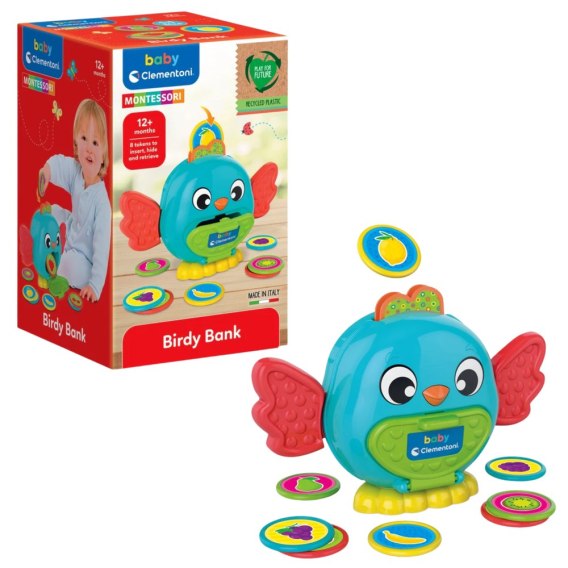 Ptaszek to zabawna skarbonka, do której dziecko może wrzucać kolorowe żetony, a następnie wyjmować je przez specjalne drzwiczki na brzuszku. Zabawka inspirowana metodą Montessori pozwala maluchowi poznawać pojęcie stałości przedmiotu oraz rozwijać umiejętności manipulacyjne.