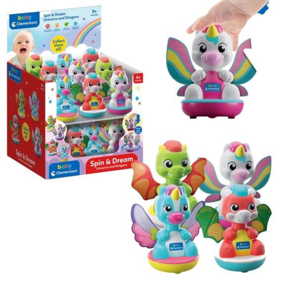 Jednorożce i Małe Smoki zmieniają się w zabawne bączki, które wprawiają dzieci w zachwyt! Po naciśnięciu głowy postać zaczyna się kręcić, a wielokolorowe tekstylne skrzydełka wirują razem z nią, tworząc magiczny efekt.