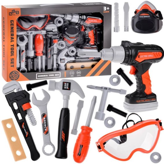 Duży zestaw narzędzi to propozycja dla każdego majsterkowicza. Zestaw w całości wykonany jest z plastiku w atrakcyjnych kolorach i realistycznych kształtach. Zabawkowy zestaw w swoim wyposażeniu posiada niezbędne akcesoria do domowych napraw. W domu zawsze jest coś do naprawy a to urwane koło od autka, odkręcona śrubka od domku dla lalek, wystająca listewka itp. Ten zestaw jest świetnie wyposażony, sprosta każdej naprawie. Ruchoma wkrętarka obraca się w obie strony, dzięki czemu wkręca i wykręca śruby. Zestaw kluczy sprawdzi się przy odkręcaniu, dokręcaniu. Młotkiem przybijesz gwoździe, a gogle ochronią oczy małego majstra.