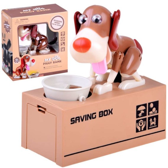 Wrzucamy monetę do miski pieska, która znajduje się przed nim, wówczas pod wpływem dotyku piesek zaczyna się ruszać tak jak by zjadał jedzonko z miski, co skutkuje iż moneta wpada do skarbonki. Piesek w trakcie zjadania pieniążka śmiesznie się porusza i trzepie uszkami. Do uruchomienia skarbonki potrzebne są 3 baterie. Skarbonka nauczy nasze dzieci oszczędzać pieniądze oraz dostarczy im dużo rozrywki, a także pomoże zrozumieć, że oszczędzanie jest całkiem fajne i niesie za sobą same pozytywy. Monety możemy swobodnie wyjąć przez otwór, który jest zasłonięty zaślepką.