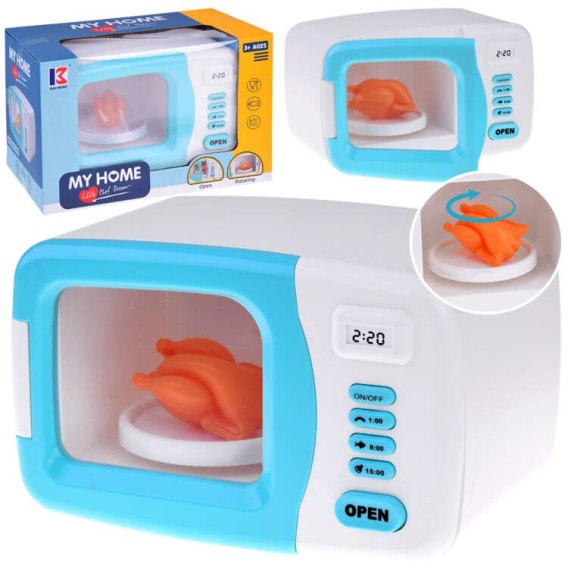 Przycisk ON/OFF odpowiedzialny jest za włączenie oraz zatrzymanie pracy mikrofalówki, zaś przycisk OPEN za otwieranie drzwi. Zabawka rozwija wyobraźnię dziecka i zachęca do zainteresowania się gotowaniem, przyrządzaniem posiłków oraz uczy pomagać innym w pracach domowych.