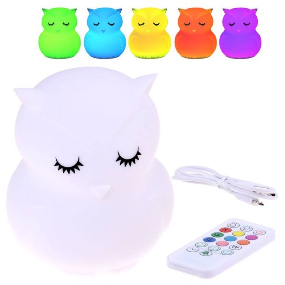 Sowa to urocza lampka nocna do pokoju dziecka. Lampka nocna zmieniająca kolor, rozświetlająca subtelnie straszną ciemność, zapewne zostanie najlepszą ozdobą każdego dziecięcego pokoju. Silikonowa lampka nocna na pilota, ładowana za pomocą kabla USB.