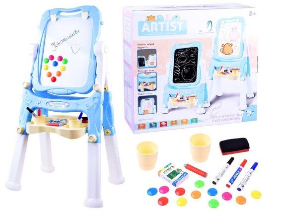 Tablica posiada obracaną płaszczyznę do malowania, rysowania. Jedna strona czarna przeznaczona jest do pisania kredą, a druga magnetyczna sprawdzi się do przyczepiania magnesów, pisania pisakiem suchościeralnym lub przyczepiania kartek do malowania obrazów, rysunków. Tablica posiada półeczkę na kredki, farby akcesoria do malowania, rysowania.