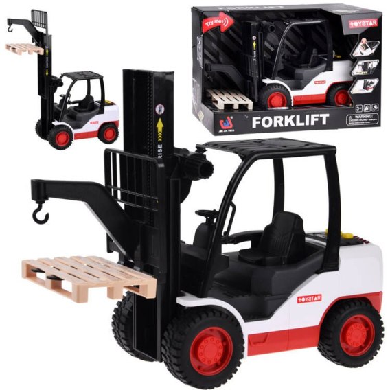 Duży wózek widłowy z paletom to idealny wybór dla każdego małego fana motoryzacji oraz budownictwa. Pojazd został dokładnie odwzorowany co sprawia że wygląda bardzo realistycznie. Auto posiada napęd frykcyjny, dzięki czemu po wprawieniu w ruch kół leżących na podłożu, porusza się. Wózek widłowy wykonany został w całości z plastiku, posiada ruchome elementy, efekty świetlne, dźwiękowe, zaś koła są gumowe co pozwoli na lekkie poruszanie się pojazdu. Dodatkową zaletą jest regulowany podnośnik, który możemy uruchomić za pomocą pokrętła znajdującego się w górnej części podnośnika. Pojazd na pewno będzie fajnym uzupełnieniem kolekcji maszyn budowlanych każdego miłośnika tych pojazdów i sprosta każdemu ładunkowi.