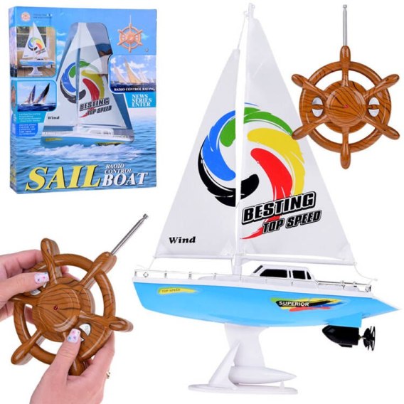 Sterowanie pilotem: Jacht jest sterowany za pomocą pilota radiowego. Pilot ma przyciski do sterowania ruchem jachtu do przodu, tyłu, w lewo i w prawo.