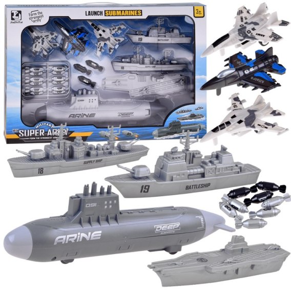 Zestaw małego żołnierza samoloty, statki wojskowe, łódź podwodna to wszystkie niezbędne sprzęty do prowadzenia działań batalistycznych. Mały strateg będzie miał do dyspozycji morską flotę oraz trzy samoloty bojowe patrolujące obszar z powietrza. Zestaw w całości wykonany został z plastiku w adekwatnej kolorystyce i grafice. Dodatkowo łódź podwodna posiada napęd na dwa tylne koła, dzięki czemu zabawa może być bardziej realistyczna.