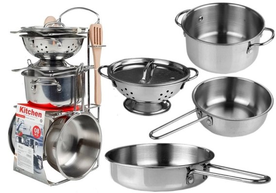 Prezentowany przez nas zestaw składa się z błyszczącej, metalowej, srebrnej zastawy, w skład której wchodzą między innymi garnek, patelnie czy cedzak. Mnogość elementów pozwala na wesołą zabawę, podczas której maluchy mogą udawać, że przygotowują wyśmienite potrawy, a także serwować je swoim rodzicom, a także misiom i lalkom.